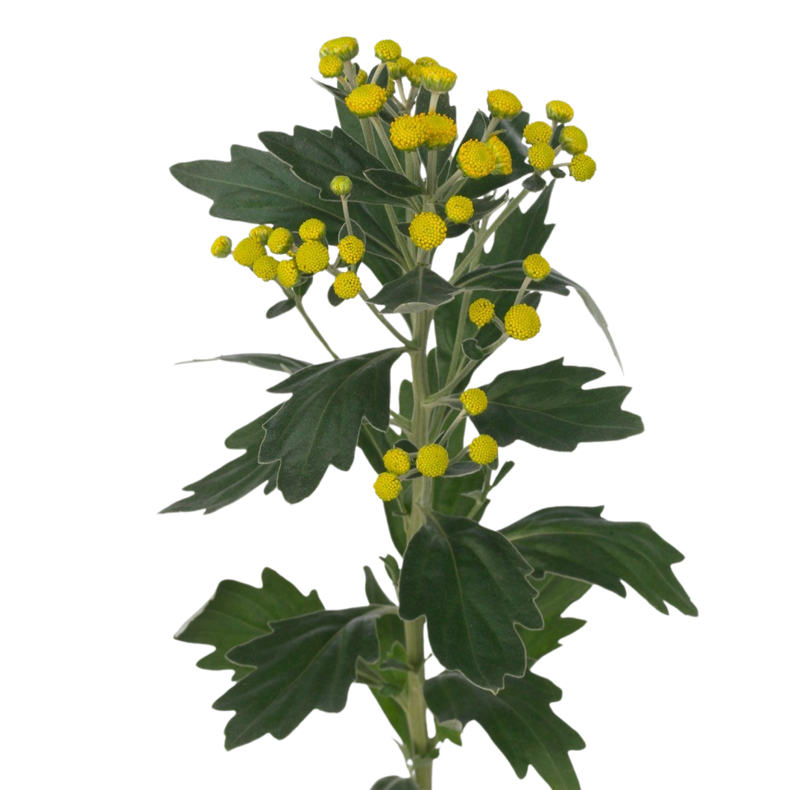 Ajanialla on harmaan/vihreät lehdet ja keltaiset kukat.