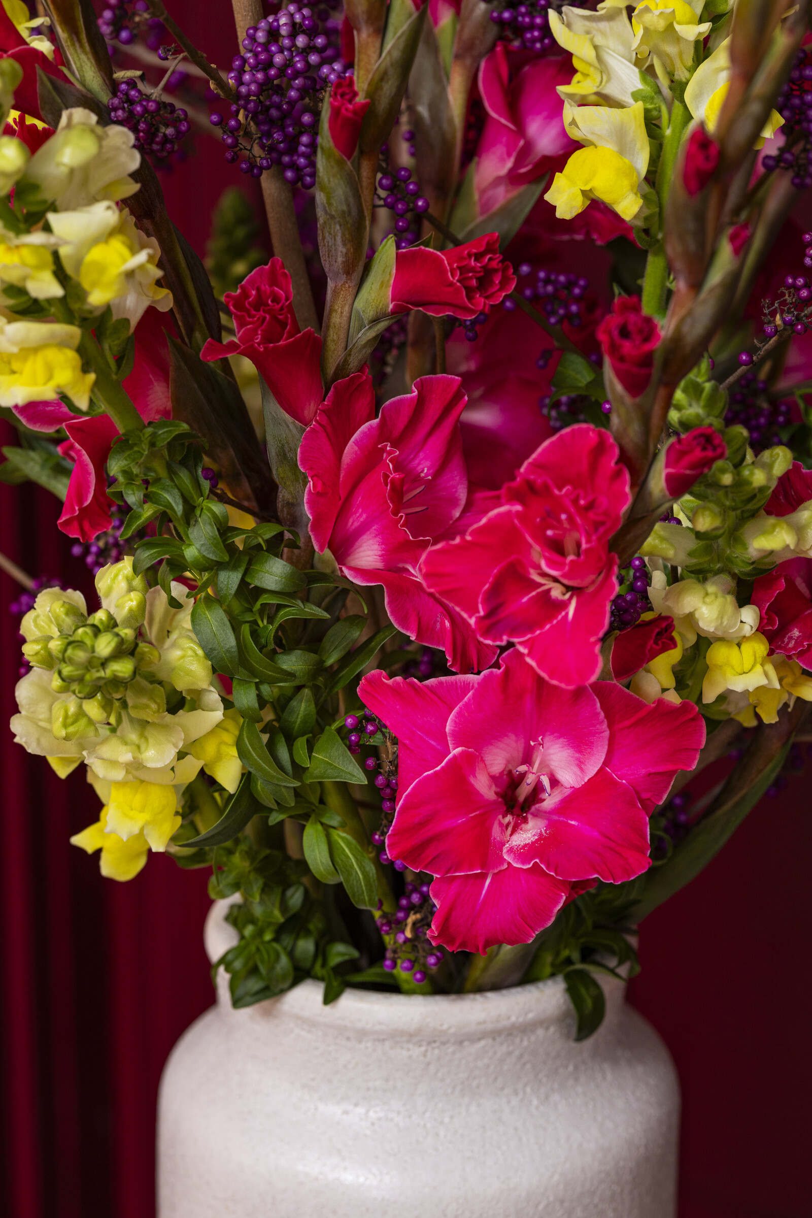 Callicarpan kirkkaat, elinvoimaiset marjat muodostavat silmiinpistävän kontrastin muihin kukkiin. Ne tuovat leikkisyyttä ja herättävät välittömästi kaikkien kimppua ihailevien huomion.