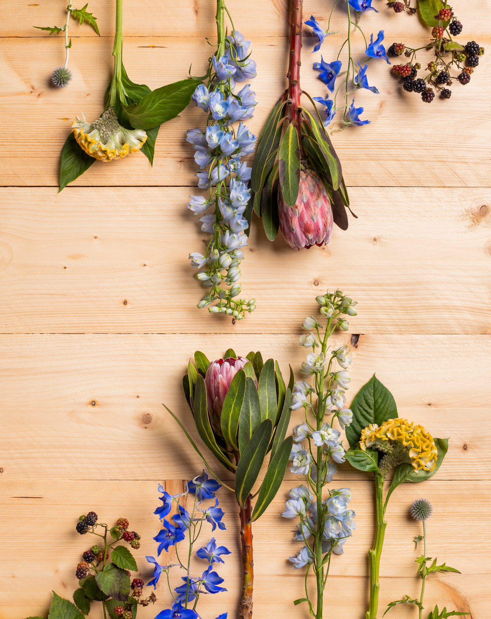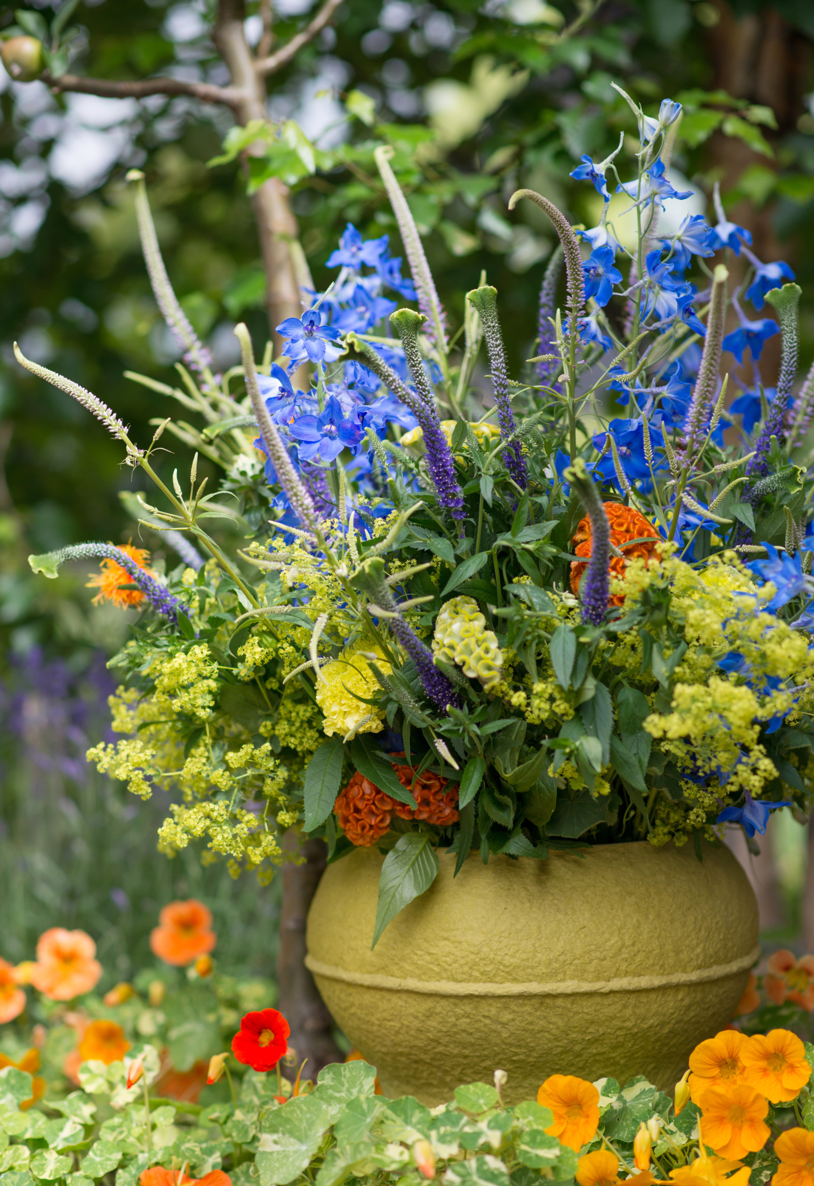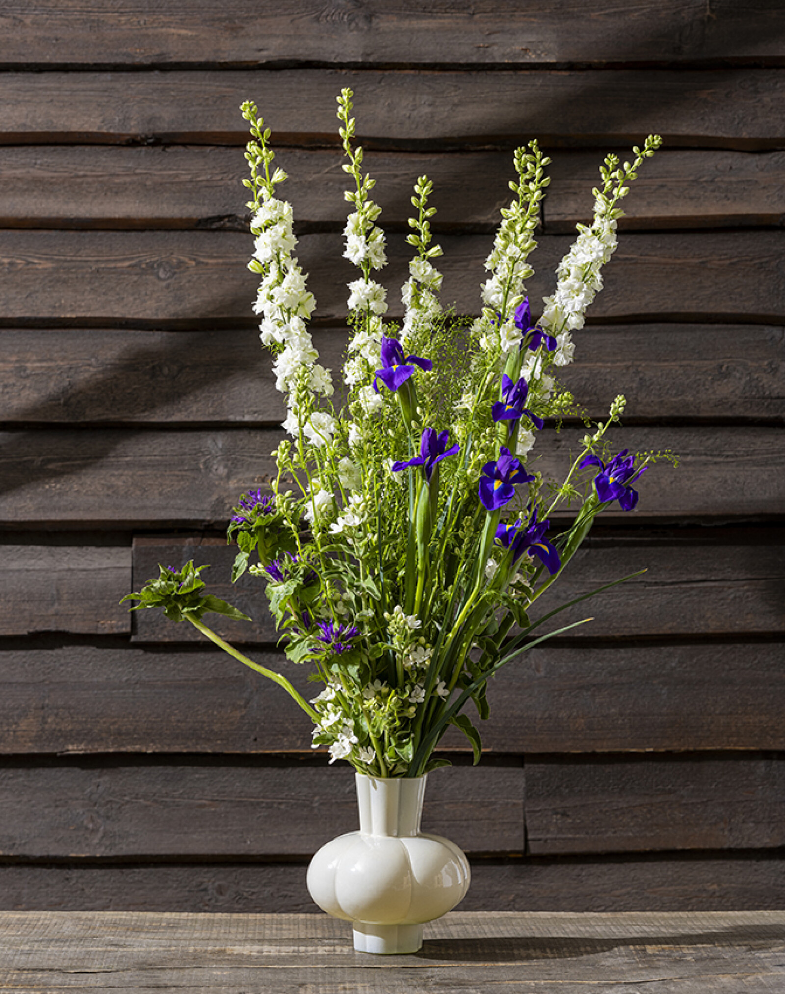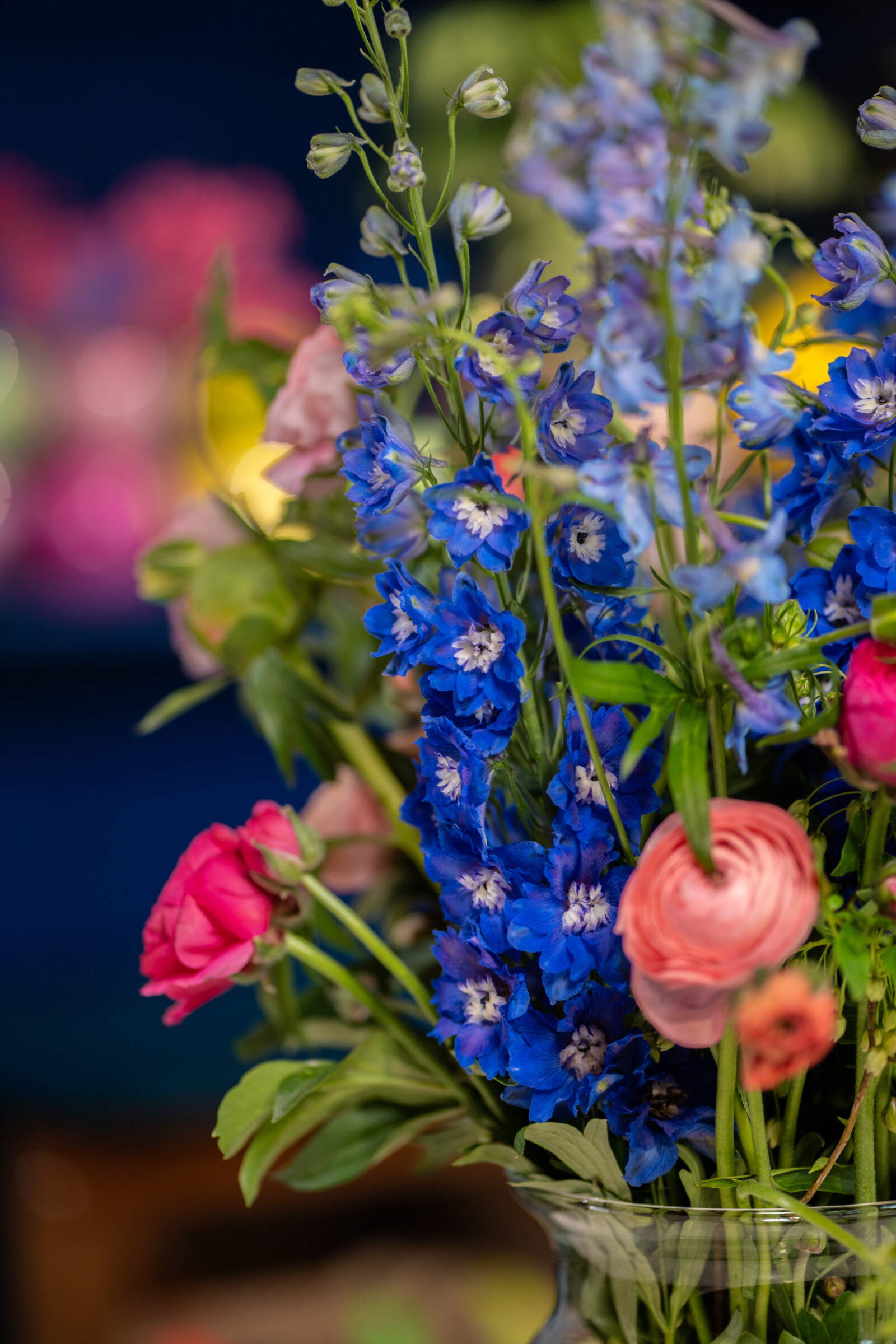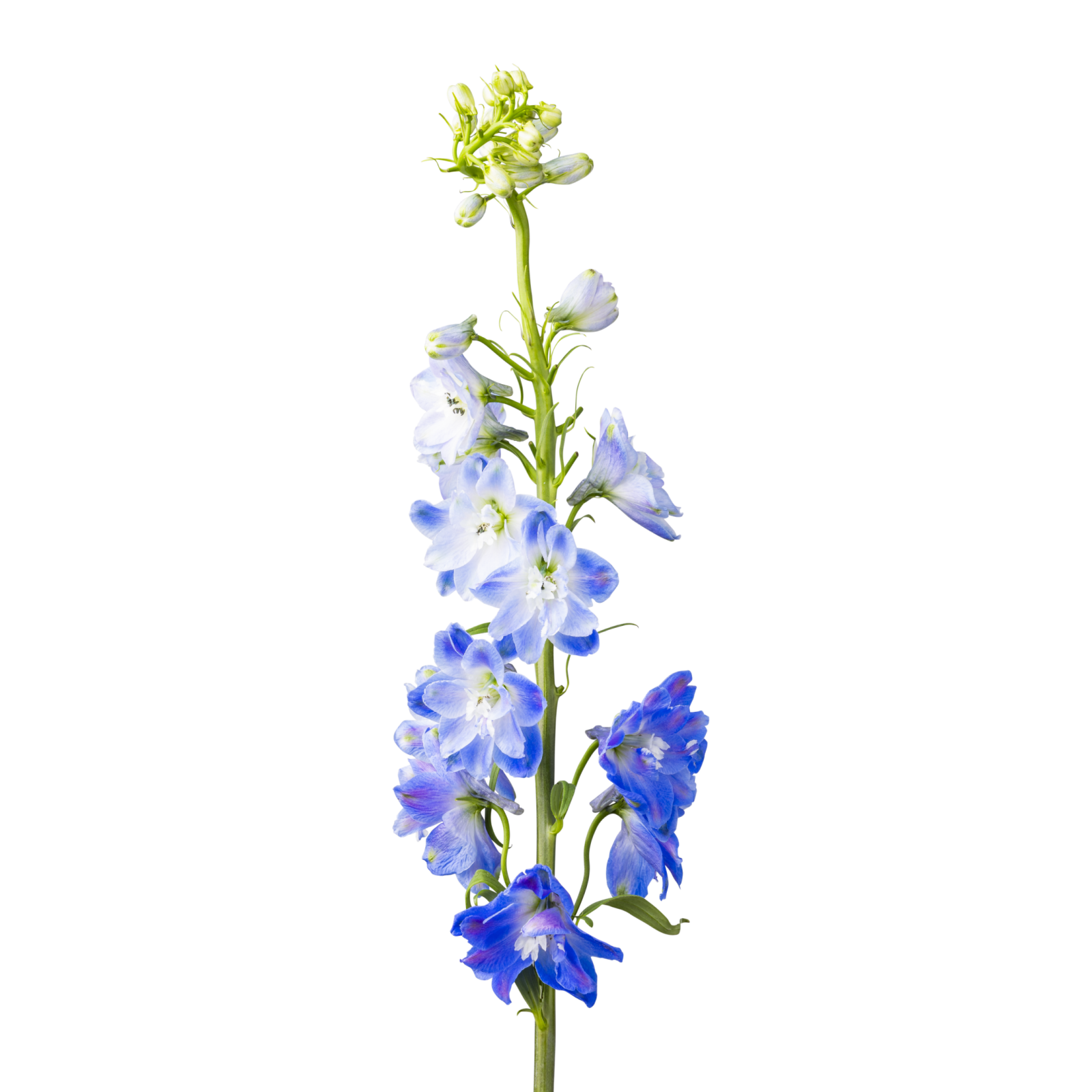 Korkeat, hoikat kukkavarret ja tiheät kukkatertut tekevät Delphiniumista hienostuneen minkä tahansa asetelman. Kukat ovat kimpussa katseenvangitsijoita kirkkaan sinisillä väreillään.