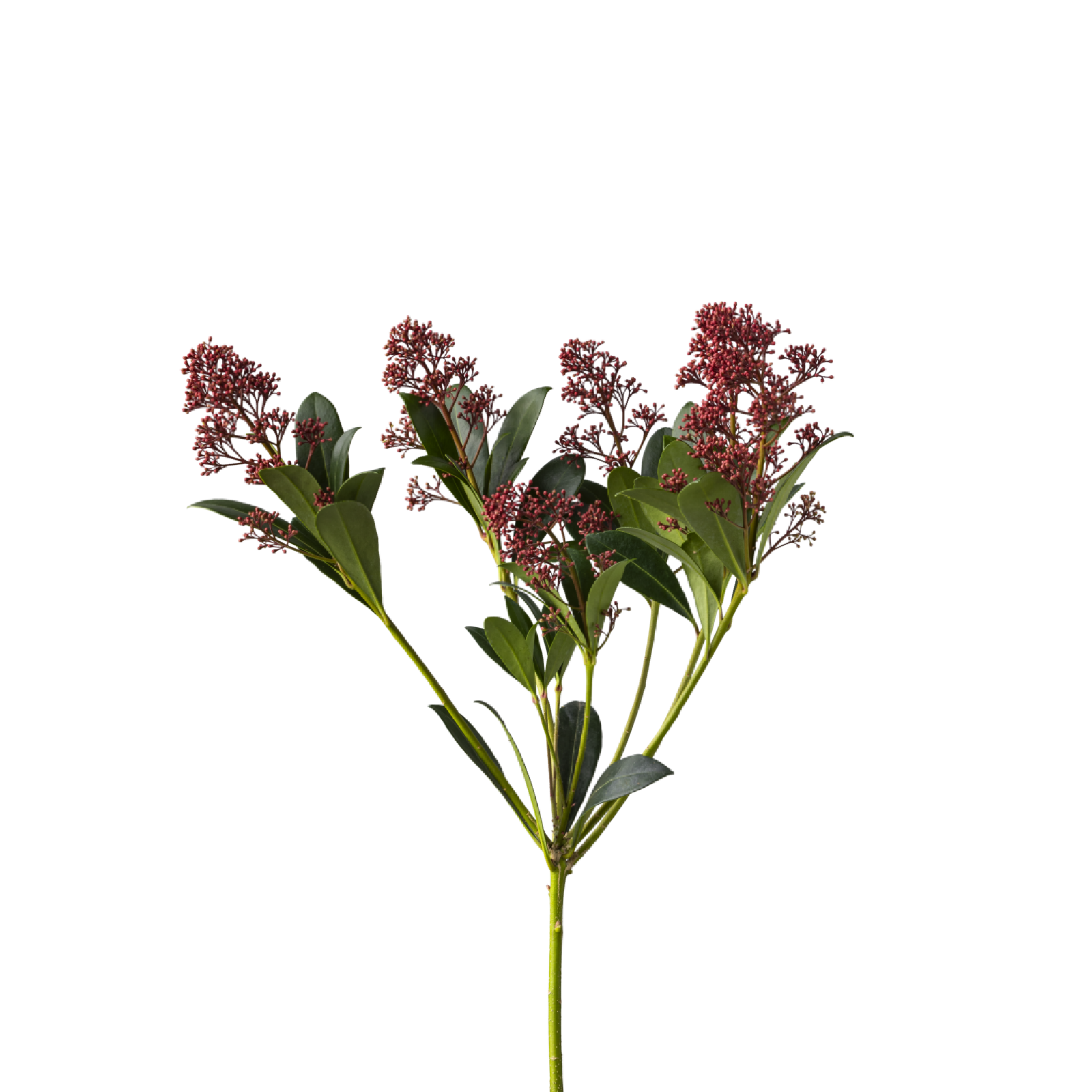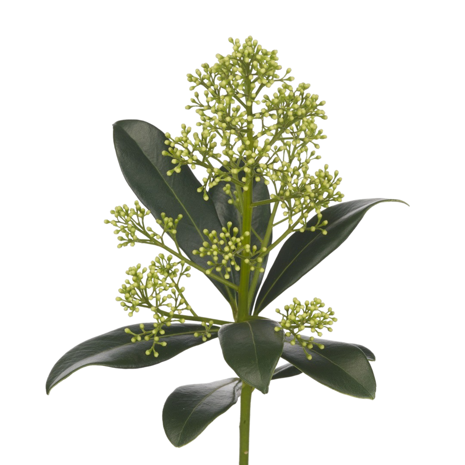 Skimmialla on rypäs pieniä silmuja, kukkia tai marjoja puisen varren päässä, jota ympäröivät tukevat tukevat vihreät lehdet.