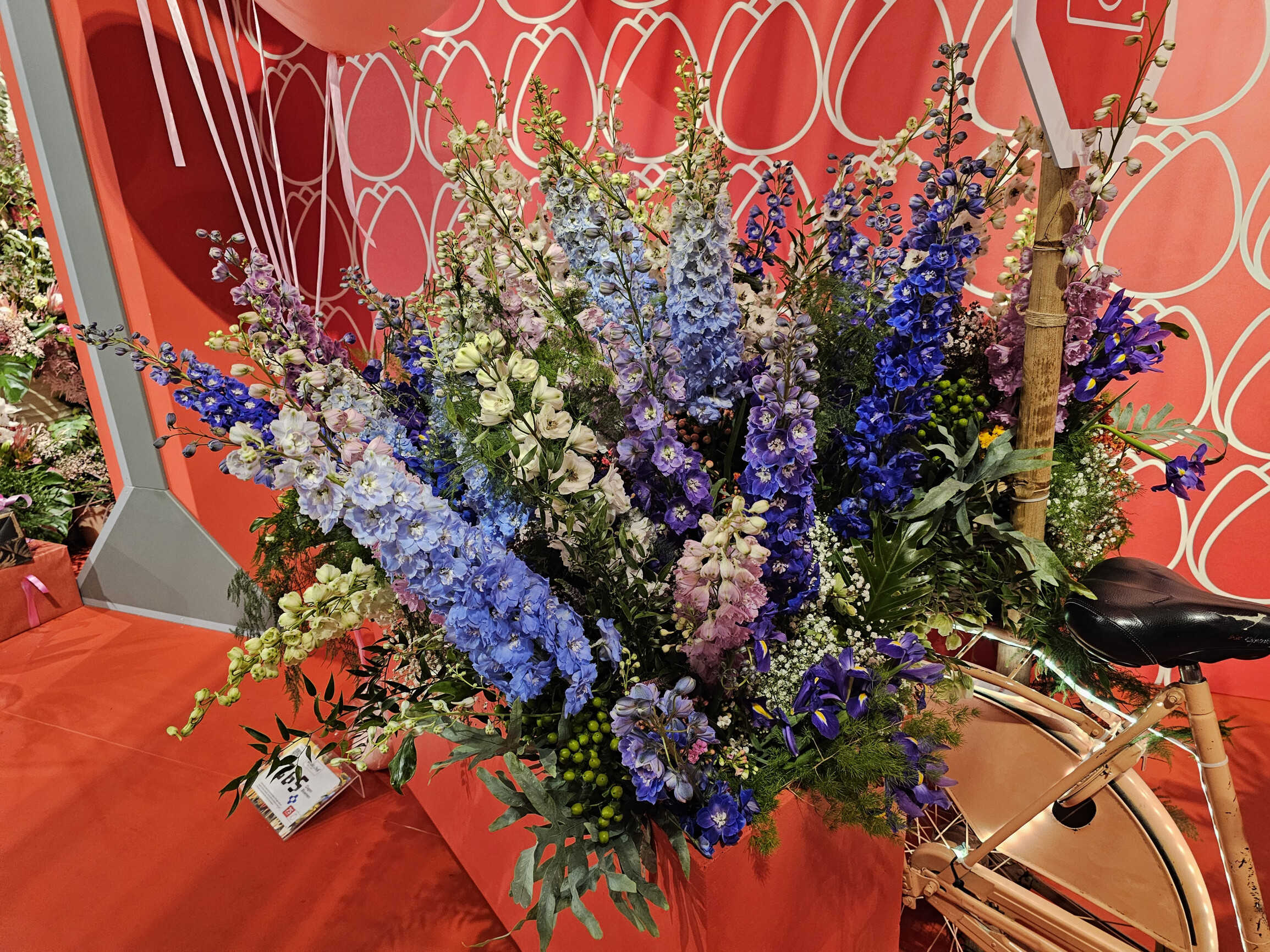 Seuraavia kukkia voi ihailla Keukenhofin Oranje Nassau -paviljongissa keskiviikkoon asti: erilaisia Hypericum-lajikkeita, Veronica Smart Wave, Eupatorium Lucky Pink, yksi- ja kaksikukkainen Delphinium, Gypsophila 'Polar Bear', Iris Blue Magic, Matricaria (kamomilla), Astrantia Billion Stars, Scabiosa fr Vanilla Scoop, Helleborus Magnific Bells ja neljä eri Phlox-väriä. Kaikkea tätä täydentävät koristeelliset viherkasvit, kuten Euonymus japonicus 'White Spire', Monster Leaf, Philodendron Xanadu, Cyrtomium falcatum ja erilaiset parsat.
